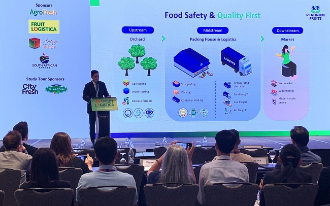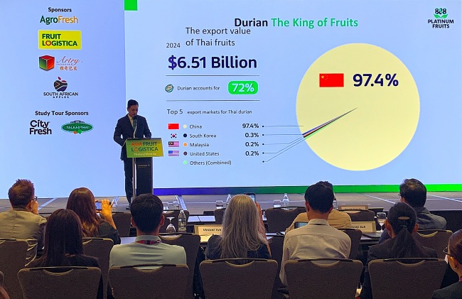 ณธกฤษ เอี่ยมสกุล ประธานเจ้าหน้าที่บริหาร บริษัท แพลททินัม ฟรุ๊ต จำกัด (มหาชน) หรือ PTF ผู้ส่งออกผักและผลไม้สดเกรดพรีเมียม เปิดเผยภาพรวมการส่งออกทุเรียนไทยในงาน Asia Fruit Logistica Bangkok Meet Up เวทีรวมผู้ประกอบการอุตสาหกรรมผักและผลไม้สดจากทั่วเอเชียตะวันออกเฉียงใต้