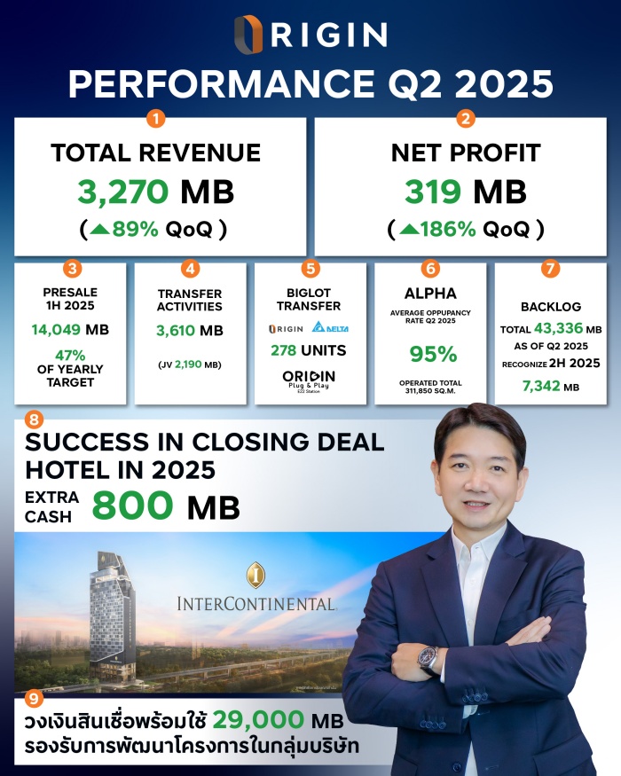 ออริจิ้น โชว์ผลงานครึ่งปีแรกกวาดพรีเซลกว่า 1.4 หมื่นล้านบาท คิดเป็น 47% ของเป้าทั้งปี 3 หมื่นล้านบาท พร้อมแผนปรับพอร์ตสินทรัพย์ ขายหุ้นอินเตอร์คอนติเนนตัล สุขุมวิท ให้ Ci:z Technologies รับเงินสดกว่า 800 ล้านบาท รอรับรู้กำไรไตรมาส 3 ส่วนธุรกิจโรงแรมขยายทำเลภูเก็ตและเชียงใหม่ รวมโรงแรมเปิดดำเนินงานแล้ว 9 แห่ง และจะเพิ่มอีก 3 แห่งในปี 2568 โดยไตรมาส 2 ทำรายได้จากการโอนโครงการกว่า 3,610 ล้านบาท กำไรสุทธิโต 3 เท่า QoQ พร้อม Backlog กว่า 4.3 หมื่นล้านบาท ทยอยรับรู้ต่อเนื่อง 5 ปี ธุรกิจคลังสินค้ามีพื้นที่เปิดดำเนินการแล้วกว่า 3.1 แสน ตร.ม. ตั้งเป้าขยายเป็น 1 ล้าน ตร.ม. เดินหน้ากลยุทธ์ Diversify สู่เมกะเทรนด์ระยะยาว