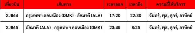 ทั้งนี้ สายการบิน XJ พร้อมให้บริการแบบเที่ยวบินประจำ 4 เที่ยวบินต่อสัปดาห์ (ทุกวันจันทร์ พุธ ศุกร์ และอาทิตย์) เริ่มให้บริการเที่ยวบินแรกในวันที่ 1 ธันวาคม 2568 ด้วยเครื่องบินแอร์บัส A330 จำนวน 367 ที่นั่ง