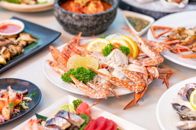 ในไลน์อาหารกว่า 30 เมนู ไฮไลต์ที่เรียกเสียงว้าว!! จากแขกทุกโต๊ะคือ กุ้งแม่น้ำย่าง ตัวโต มันเยิ้ม ย่างหอมด้วยถ่านไม้ ปูม้าเนื้อแน่น สดจากคลองด่าน เสิร์ฟคู่ซีฟู้ดซอสสูตรเฉพาะของเชฟ หอยนางรมสดบางปะกง ที่เสิร์ฟบนหินเย็น คู่เครื่องเคียงแบบไทย ซุปข้นล็อบสเตอร์ เข้มข้นแต่กลมกล่อม ขนมจีนน้ำยาปู ที่ใช้เนื้อปูจริงแบบไม่หวงวัตถุดิบ