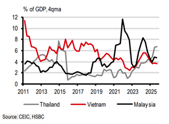 เช่นเดียวกับมาเลเซีย มูลค่าการลงทุนโดยตรงจากจีนพุ่งสูงขึ้นช่วยผลักดันพอร์ต FDI รวมของประเทศ ณ ไตรมาสที่ 3 ปี 2568 ส่วนเวียดนาม กระแส FDI ใหม่จากจีนที่ไหลเข้ามาอย่างต่อเนื่องช่วยชดเชยการลงทุนที่ลดลง ทั้งนี้ สิ่งสำคัญสำหรับอาเซียนไม่ใช่เป็นเพียงเรื่องการย้ายฐานการผลิตเท่านั้น แต่ยังเป็นประเด็นที่ว่าว่าภูมิภาคอาเซียนจะสามารถเปลี่ยนแนวโน้มนี้ให้เป็นส่วนแบ่งตลาดที่ใหญ่ขึ้นในระดับโลกได้สำเร็จมากน้อยเพียงใด
