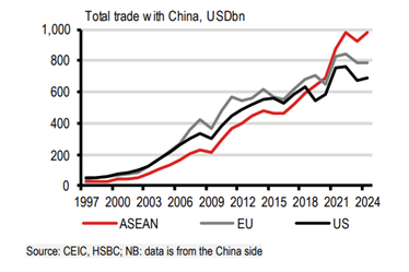 โดยปี 2567 มูลค่าการค้าทวิภาคีทะลุ 984,000 ล้านดอลลาร์สหรัฐ (30.7 ล้านล้านบาท) ทำให้อาเซียนครองตำแหน่งคู่ค้าที่ใหญ่ที่สุดของจีนเป็นปีที่ห้าติดต่อกัน