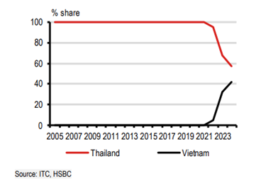 โดยส่วนแบ่งตลาดในจีนของเวียดนามพุ่งจาก 0% เป็นกว่า 40% ในเวลาเพียงสามปี (กราฟที่ 2) นอกจากนั้นปัจจุบันมาเลเซียซึ่งมีชื่อเสียงในทุเรียนสายพันธุ์มูซังคิงก็เข้าร่วมชิงส่วนแบ่งการตลาดทุเรียนในประเทศจีนด้วยหลังจากตกลงส่งออกทุเรียนสดตั้งแต่สิงหาคม 2567